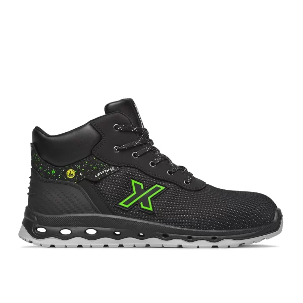 Calzatura alta interamente in tessuto antistrappo, con tecnologia EasyFit per calzata comoda. Puntale in alluminio T-Alu e inserto antiperforazione SafeFlex Conductive non metallico, specifico per articoli dissipativi. Suola in poliuretano in doppia densità 2D Air-Hole