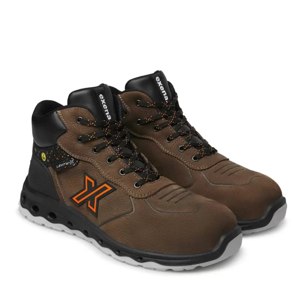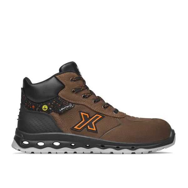 Calzatura alta in morbida pelle fiore marrone, con tecnologia EasyFit per calzata comoda. Puntale in alluminio T-Alu e inserto antiperforazione SafeFlex Conductive non metallico, specifico per articoli dissipativi. Suola in poliuretano in doppia densità 2D Air-Hole